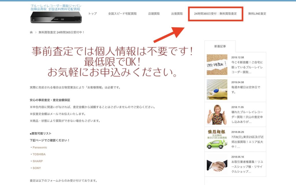 ブルーレイレコーダー買取ジャパン公式サイトの「24時間365日受付:無料買取査定」をクリック。